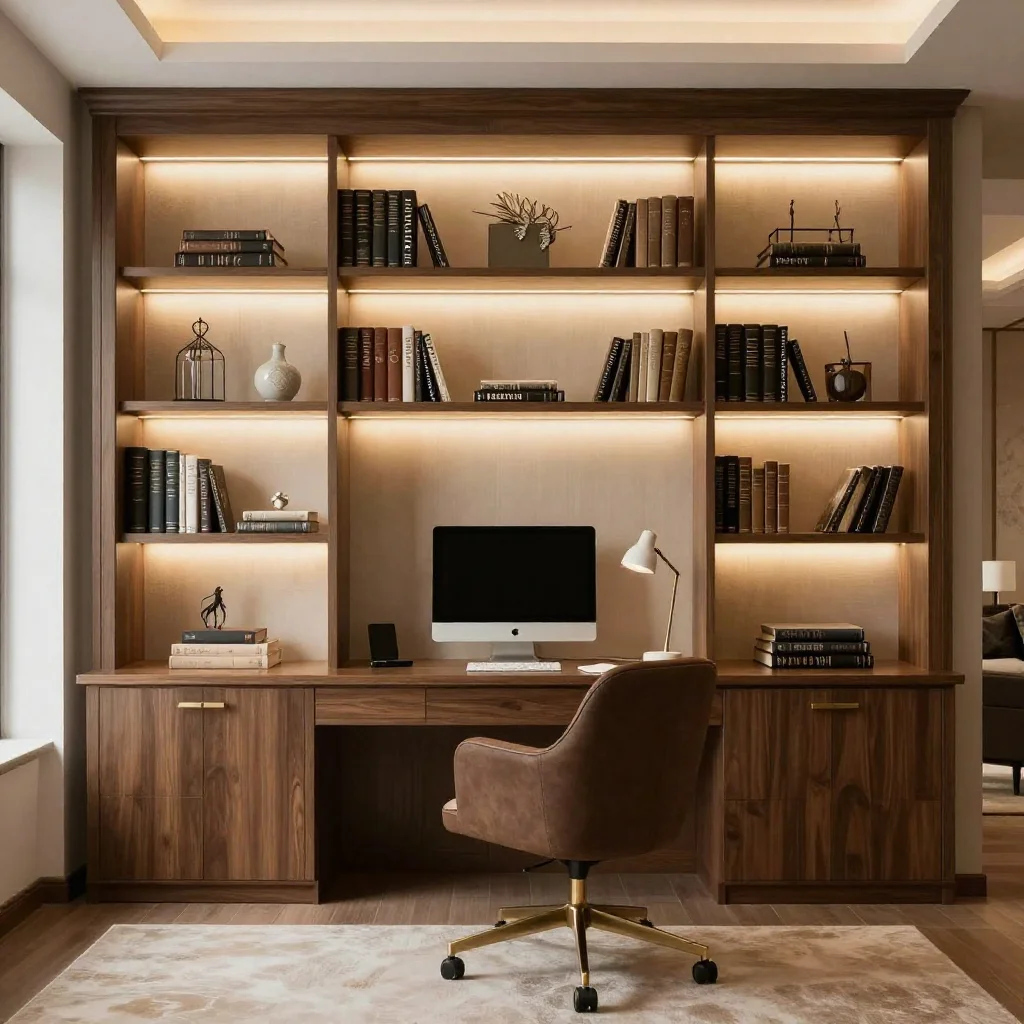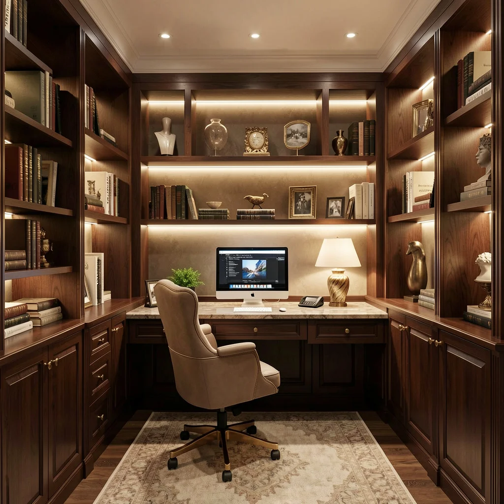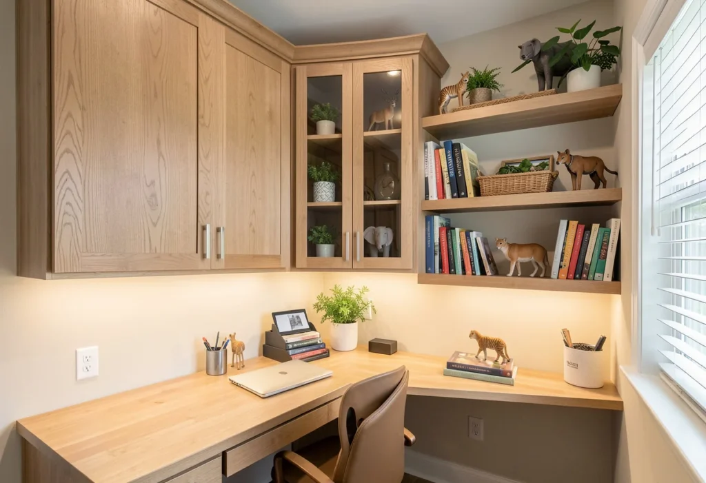Custom cabinets, wall shelves, and multi-purpose furniture work together to create a highly efficient small home office. Tailored cabinetry maximizes unused corner and vertical space, offering designated storage for files, books, and electronics without crowding the floor. Wall shelves and floating units add extra storage capacity while maintaining an open, airy feel that prevents the room from appearing cramped. Incorporating multi-purpose furniture such as storage ottomans, filing cabinets that double as side tables, or benches with hidden compartments further enhances functionality, ensuring every piece serves more than one purpose in a compact space.