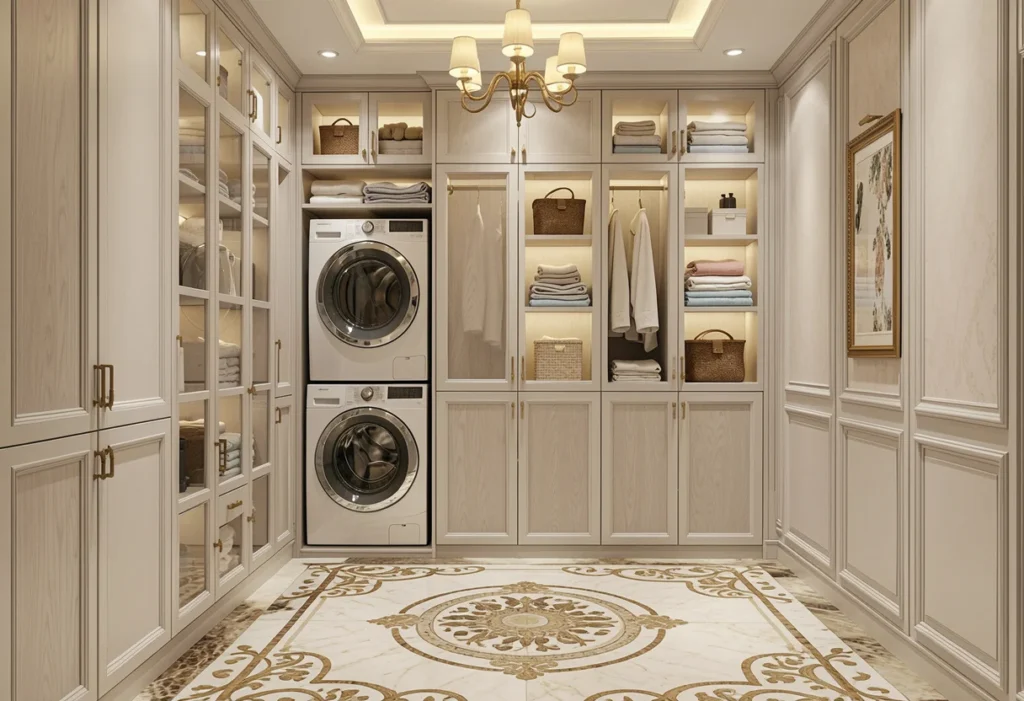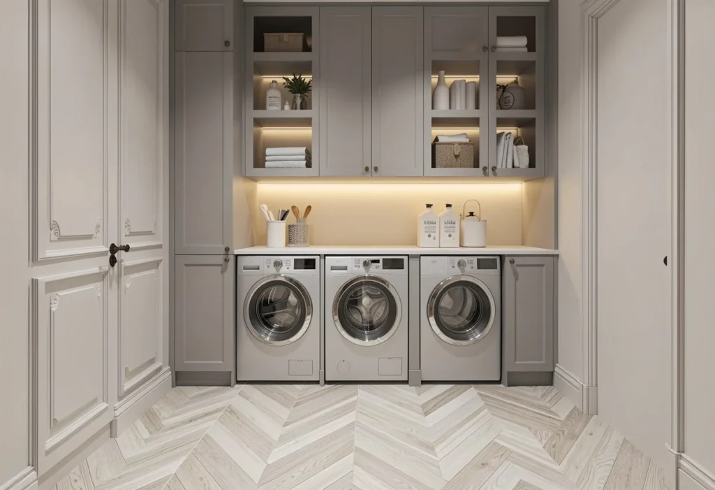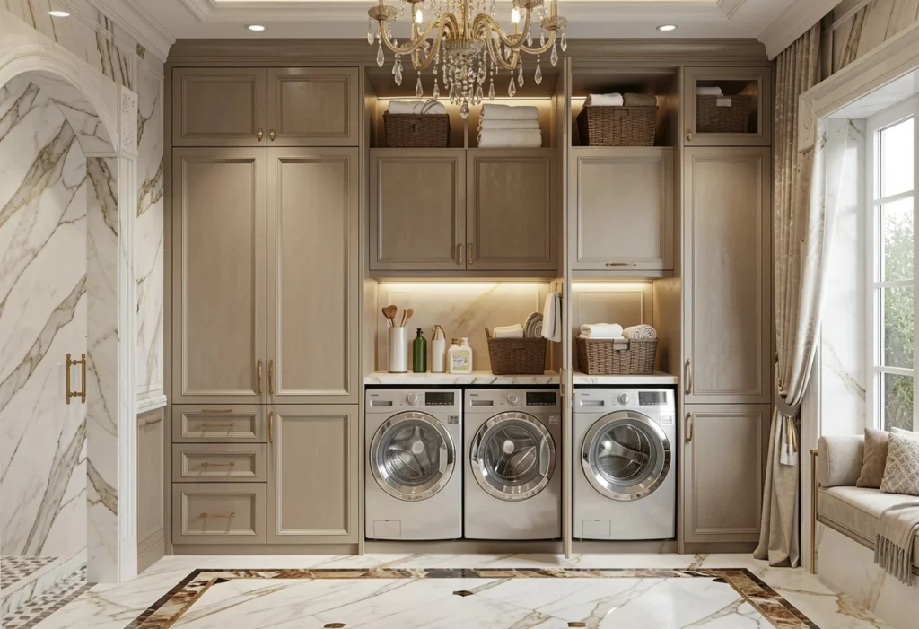 Washers and dryers define the layout of the laundry room and establish the primary workflow for daily routines. Cabinetry adapts around appliances instead of competing with them, which creates a balanced and efficient workspace. Storage surrounds equipment through side cabinets, overhead shelving, stacked unit framing, and utility towers that organize supplies and support nearby work zones. These elements create clear structure around the washer and dryer area. Supplies remain accessible. Surfaces remain usable. Movement between tasks becomes smoother and more direct. Every inch gains purpose, and the laundry room functions as a coordinated and dependable work space for everyday use.