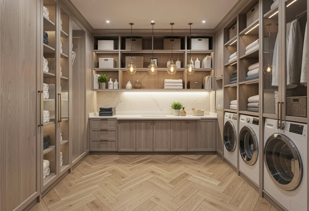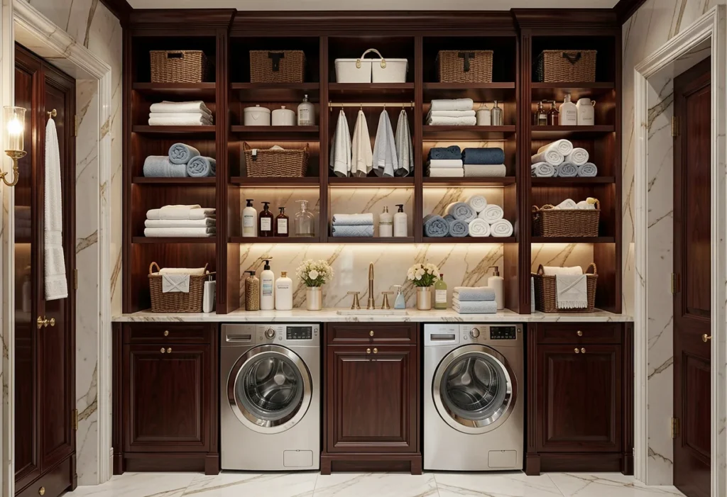 These storage systems support fast sorting, quick transfers, and clean organization inside the laundry room. Items move efficiently between baskets, hampers, and work surfaces without unnecessary steps. Defined storage zones reduce confusion and keep clothing separated from the start of the process. Laundry stays contained within designated areas, which prevents clutter from spreading across countertops or floors. This structure improves workflow and keeps each stage of the routine clear and manageable. The laundry room feels more organized, efficient, and easier to maintain throughout daily use.