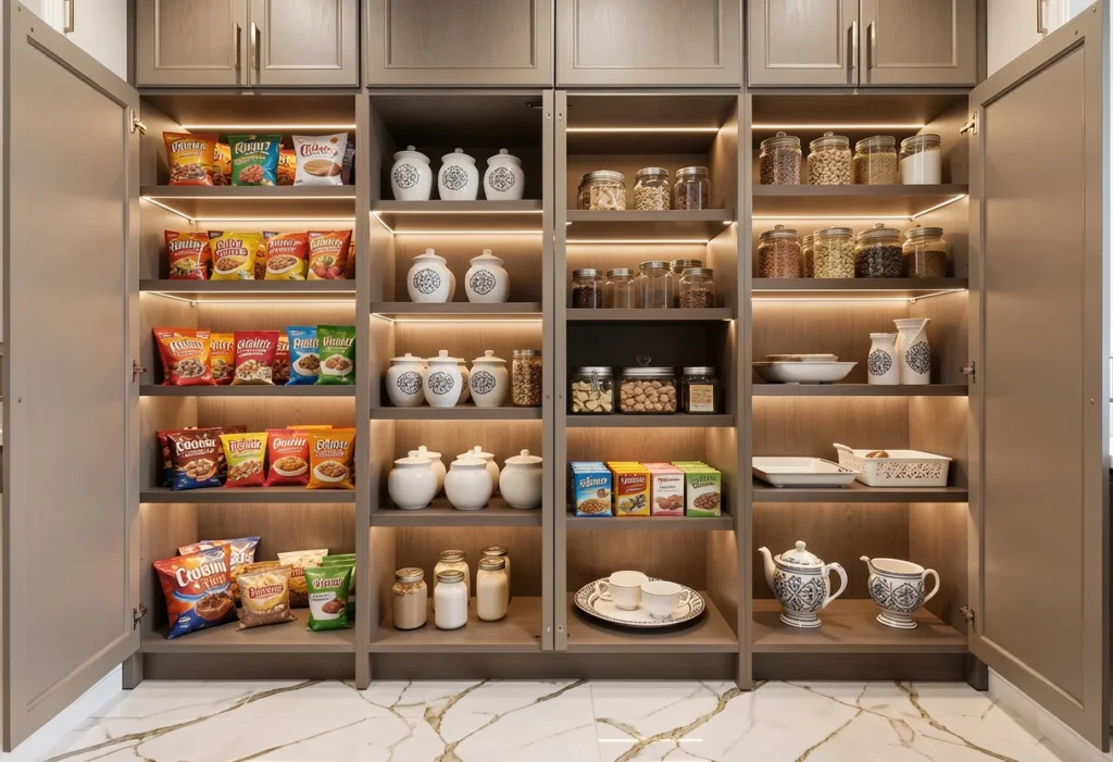 Walk-in pantries offer the greatest flexibility for storage. Multiple shelving levels allow storage for dry goods, canned foods, and kitchen staples. Drawers and vertical storage zones create dedicated areas for different ingredients. This layout supports clear organization and strong visibility.
