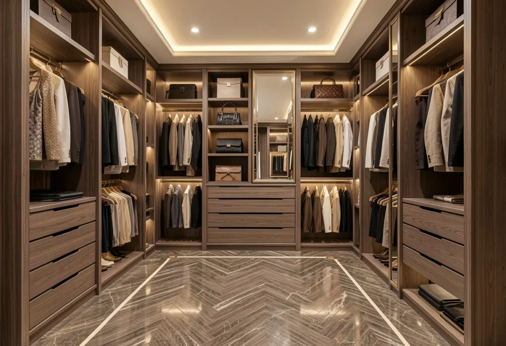Durability is a key consideration in walk-in closet design, ensuring that storage remains functional and attractive for years. High-quality shelving supports the weight of clothing, shoes, and accessories without sagging, providing reliable performance even with daily use. Smooth, easy-to-clean surfaces simplify maintenance while preserving the closet’s appearance, allowing homeowners to keep the space looking fresh and organized. Coordinated cabinet finishes tie the design together, creating a cohesive storage environment that complements the home’s overall interior style and enhances the sense of order throughout the space.